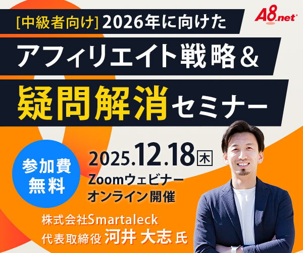 2025年の疑問を年内に解消し、2026年に向けて確かな一歩を踏み出したい!という方に向けた【【中級者向け】2026年に向けたアフィリエイト戦略&疑問解消セミナー】を開催することとなりましたので、お知らせします!