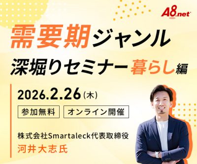 ※セミナーは、A8.netに登録されているメディア会員様を対象としております。A8.netのご登録がお済でない方は、会員登録(無料)をお願いいたします。